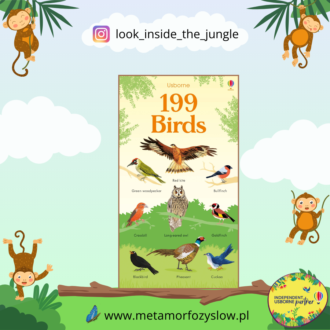 199 Birds – kartonowy słownik obrazkowy po angielsku. Przedstawia aż 199 ptaków z różnych stron świata i terytoriów. Książka przyda się podczas prowadzenia obserwacji przyrodniczych na łąkach, w lasach, nad morzem, ale też w trakcie egzotycznych wypraw, na przykład na sawannę.