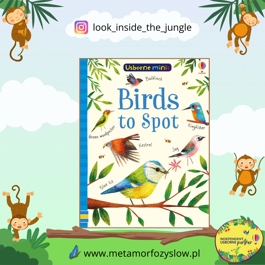 Birds to Spot – mały przewodnik po świecie ptaków. Książka po angielsku dla dzieci w wieku przedszkolnym i szkolnym. Czytelnik znajdzie w niej najpopularniejsze ptaki żyjące w różnych środowiskach, aktywne o różnych porach dnia: