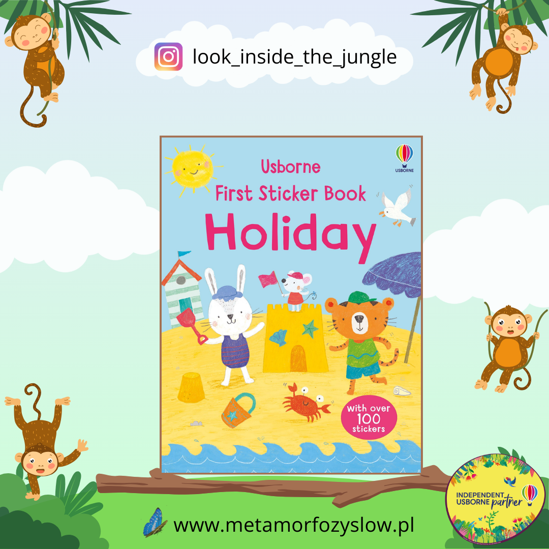 First Sticker Book Holiday – wyklejanka po angielsku dla dzieci w wieku przedszkolnym. Bohaterami są sympatyczne zwierzęta wesoło spędzające czas na wakacyjnych zabawach. Na każdej rozkładówce dziecko znajdzie krótki tekst oraz ilustrację do uzupełnienia naklejkami. Książka wydawnictwa Usborne.