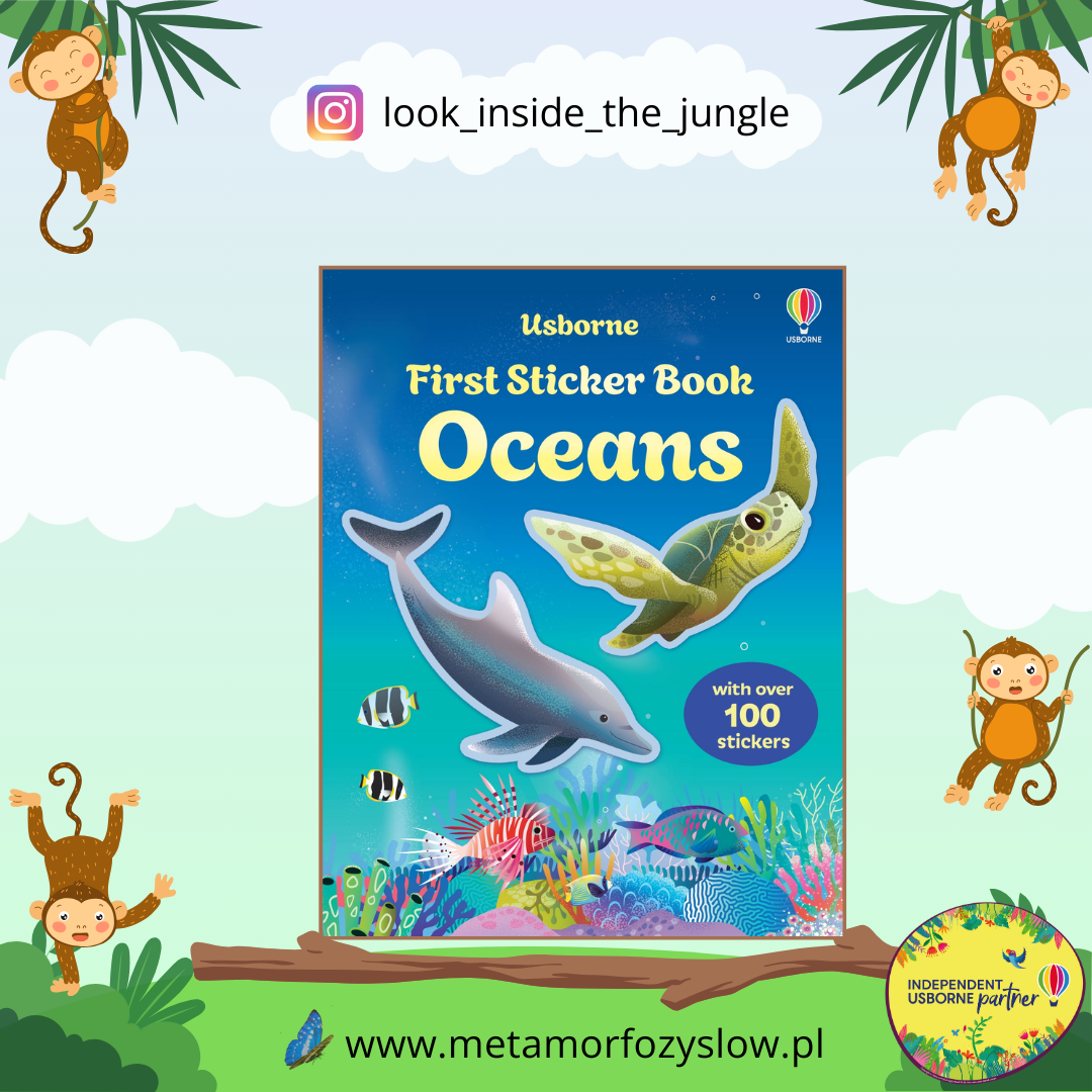 First Sticker Book Oceans – wyklejanka od Usborne dla dzieci w wieku szkolnym. Na każdej rozkładówce czytelnicy znajdą scenkę prezentującą faunę i florę oceanów oraz krótkie wprowadzenie po angielsku. Do książki autorzy przygotowali zbiór linków z dodatkowymi materiałami.