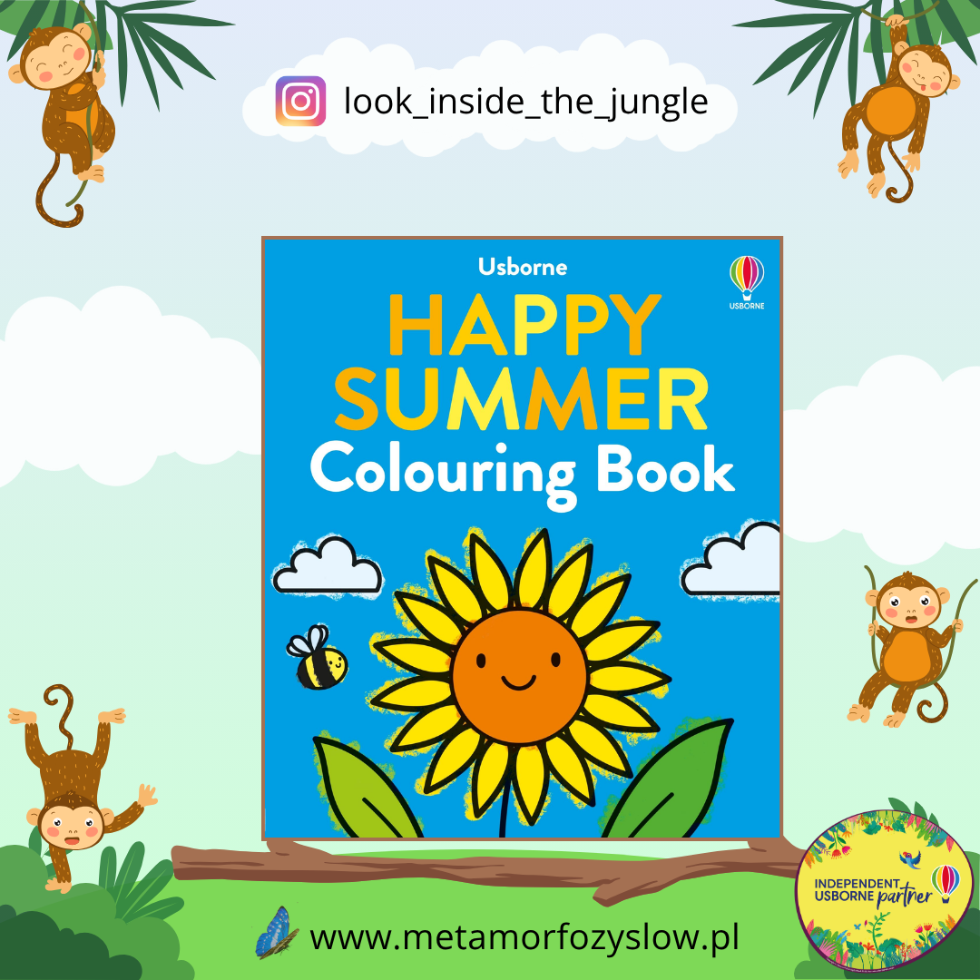 Happy Summer Colouring Book – duża kolorowanka dla najmłodszych z serii Usborne First Colouring. Tematyka ilustracji jest związana z latem. Jeden obrazek na stronie, wyraźne kontury, uproszczone rysunki, duże obiekty do kolorowania – w sam raz dla dzieci, które dopiero uczą się kolorować. Na każdej stronie jedno wyrażenie lub zdanie po angielsku opisujące ilustrację.