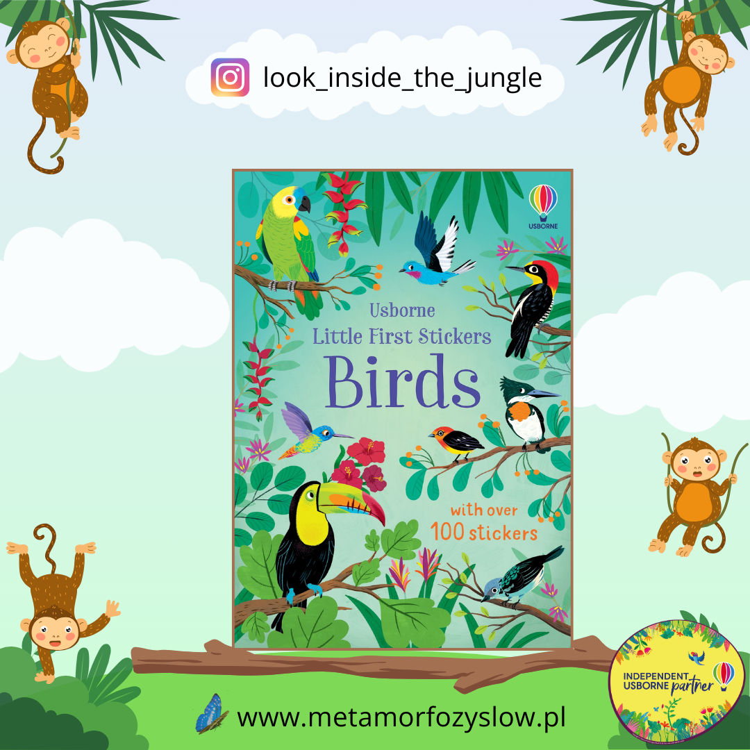 Little First Stickers Birds – książka po angielsku do uzupełniania naklejkami. Motywem przewodnim są ptaki z różnych środowisk. Książka poszerza wiedzę z zakresu przyrody oraz rozwija słownictwo angielskie. Każda scenka zawiera krótki opis. Pod naklejkami zostało umieszczone dodatkowe słownictwo z nazwami prezentowanych okazów ptaków. Do książki autorzy przygotowali zbiór linków z materiałami: filami edukacyjnymi, kartami pracy, quizami, grami online.