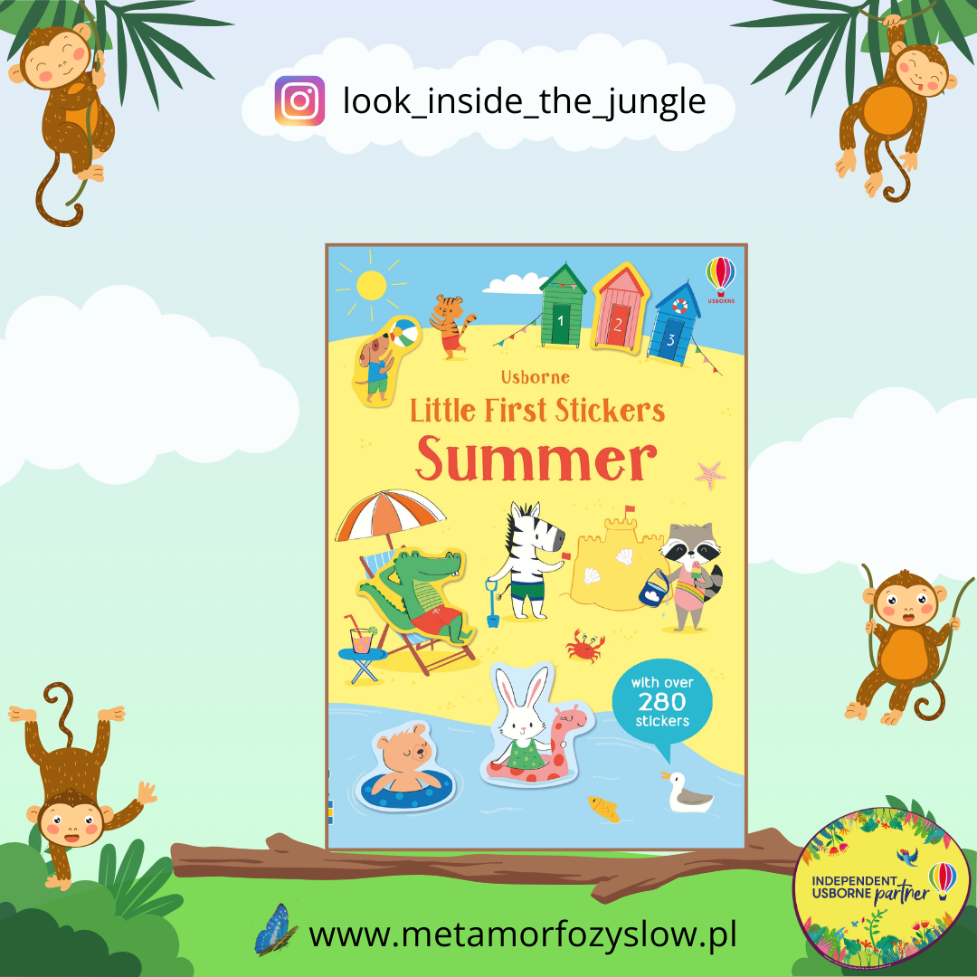 Little First Stickers Summer – książka z naklejkami po angielsku dla dzieci w wieku przedszkolnym. Dzieci wyklejają scenki przedstawiające różne letnie aktywności naklejkami dołączonymi na końcu. Jasne, pastelowe ilustracje przedstawiają zwierzątka w różnych miejscach. Wyklejanka rozwija słownictwo angielskie związane z latem, podróżami i krajobrazami.