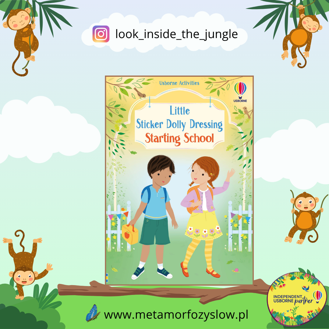 Little Sticker Dolly Dressing Starting School – książka z naklejkami dla dzieci, które rozpoczynają szkołę. Z krótkich opisów po angielsku i scenek do uzupełnienia naklejkami mali czytelnicy dowiedzą się między innymi, jak należy się przygotować do szkoły oraz jak wygląda przeciętny dzień w szkole.