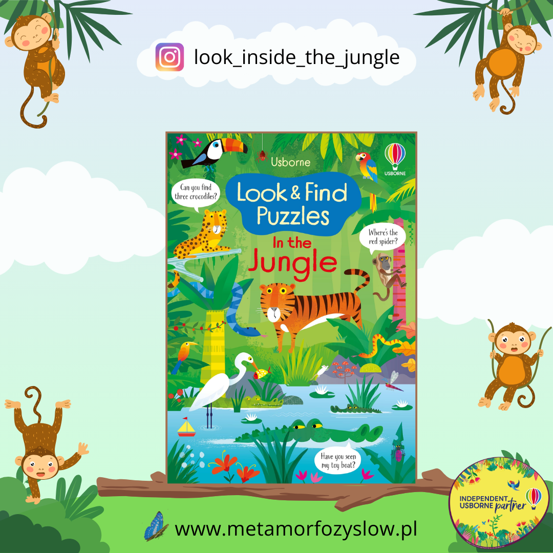 Look and Find Puzzles In the Jungle – wyszukiwanka Usborne, której motywem przewodnim są zwierzęta żyjące w dżungli. Na każdej rozkładówce trzeba odnaleźć odpowiedź na kilka pytań oraz znaleźć wskazane w opisie elementy. Książka ułatwia wprowadzanie języka angielskiego przez zabawę.
