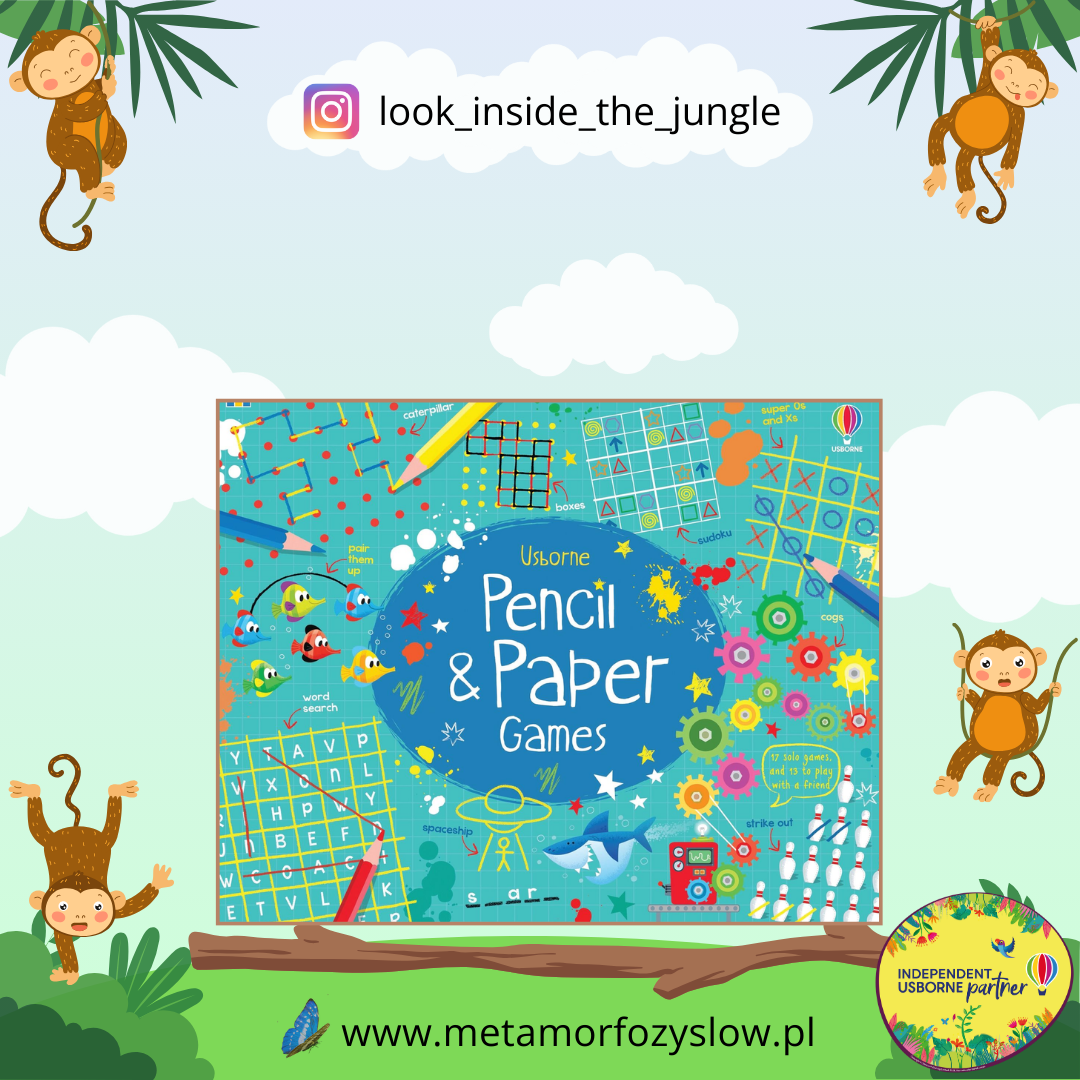 Pencil and Paper Games – zestaw dwustronnych kart pracy z grami, łamigłówkami i zagadkami, w tym sudoku, kółko i krzyżyk, kolorowanki, lustrzane odbicia, obliczenia matematyczne, wyszukiwanki słowne. Książka po angielsku dla dzieci w wieku szkolnym wydawnictwa Usborne.