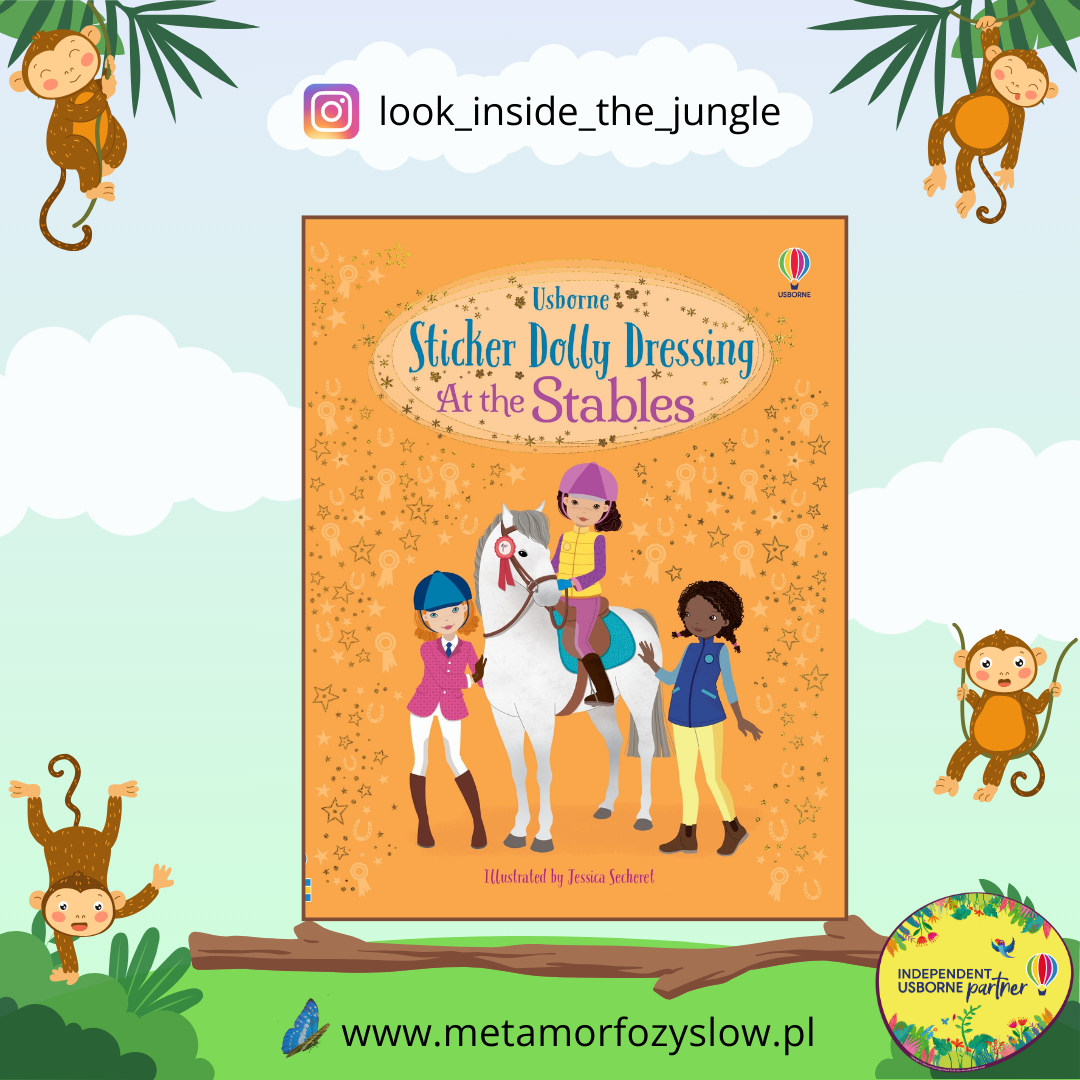 Sticker Dolly Dressing At the Stables – książka z naklejkami dla małych fanów koni, kucyków i jazdy konnej. Na każdej rozkładówce czeka na nich krótki tekst oraz scenka ze stajni, zagrody bądź toru przeszkód dla koni. Publikacja po angielsku wydawnictwa Usborne.