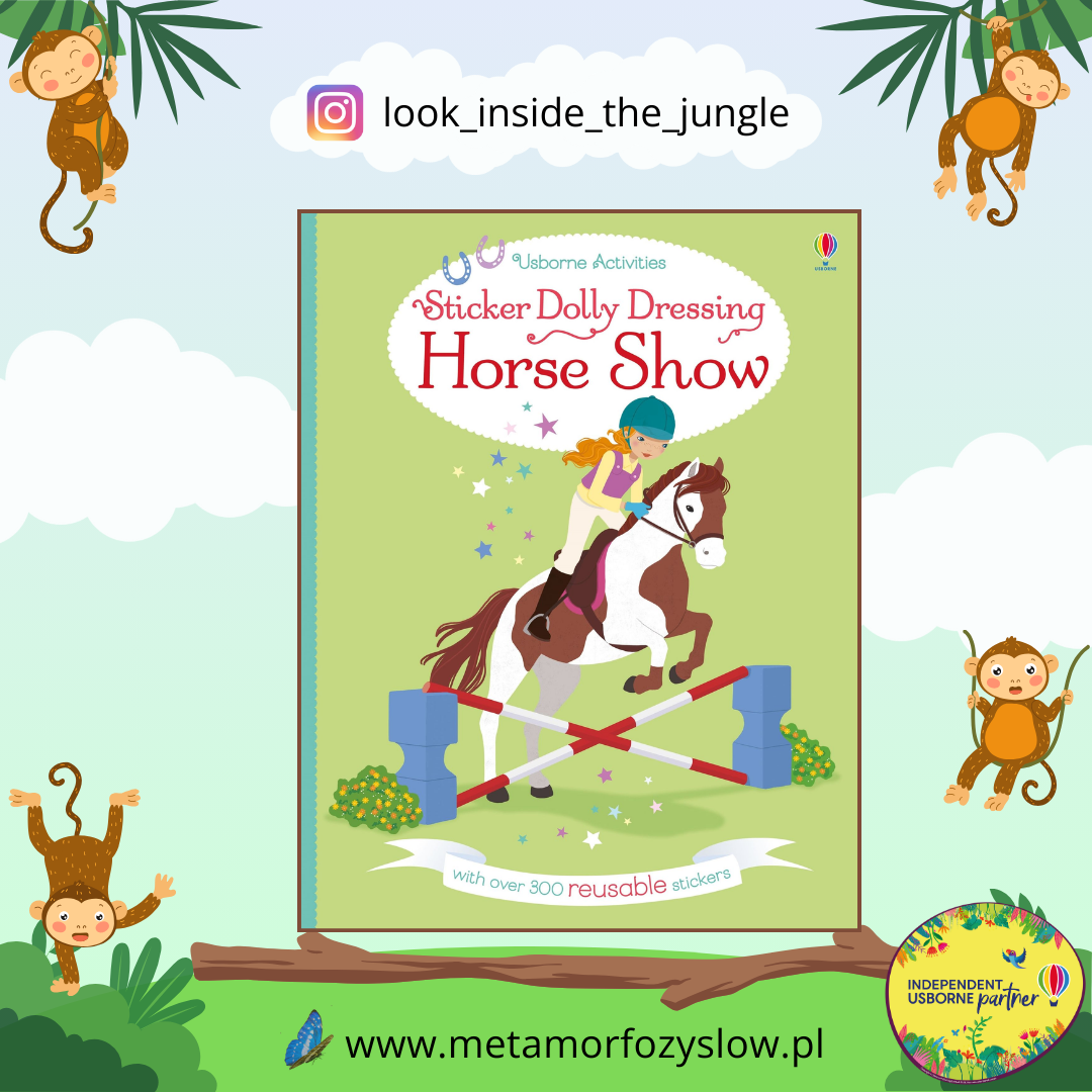 Sticker Dolly Dressing Horse Show – wyklejanka po angielsku dla małych wielbicieli kucyków, koni i jeździectwa. Dzieci ozdabiają scenki naklejkami. Publikacja wydawnictwa Usborne dla dzieci w wieku szkolnym.