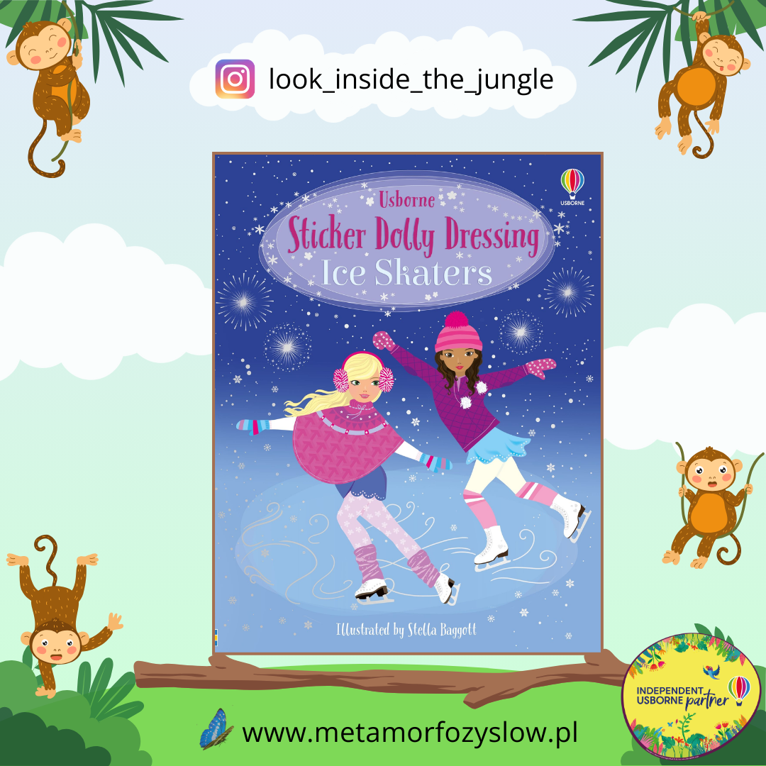 Sticker Dolly Dressing Ice Skaters – duża wyklejanka przedstawiająca lalki podczas jazdy na łyżwach. Na poszczególnych stronach czytelnicy znajdą scenki z przygotowań podczas sesji treningowych, zawodów oraz pokazu baletowego na lodzie. Książka rozszerza słownictwo z zakresu sportu i ubierania się. Przed każdą scenką znajduje się krótki tekst po angielsku, a w opisach naklejek dodatkowe słownictwo. Książka po angielsku wydawnictwa Usborne.
