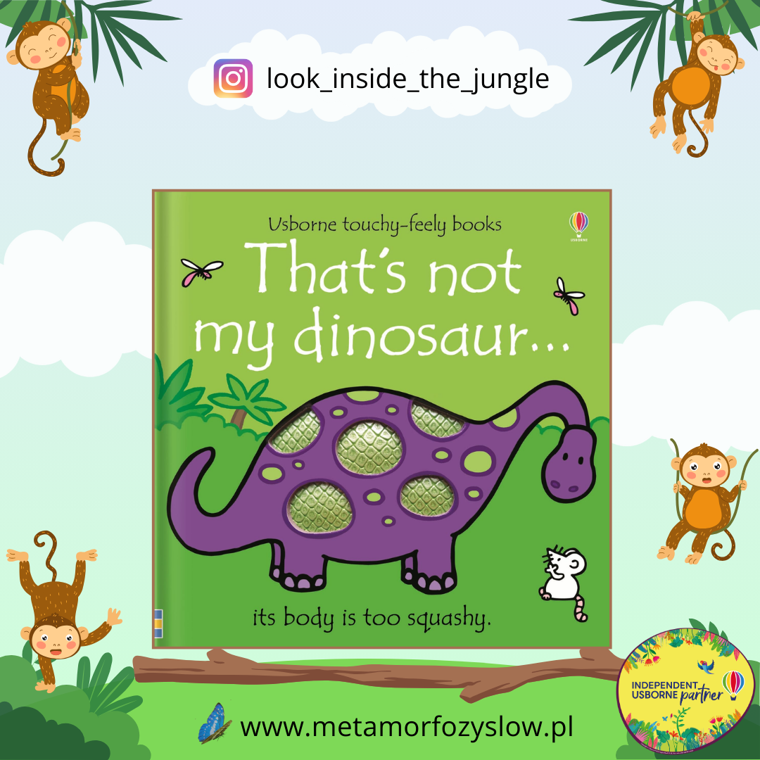 That's not my dinosaur… – książka sensoryczna dla niemowląt. Na każdej stronie maluszek znajdzie elementy sensoryczne wkomponowane w postać dinozaura oraz krótki fragment tekstu po angielsku uzupełniany przez inne rzeczowniki i przymiotniki.