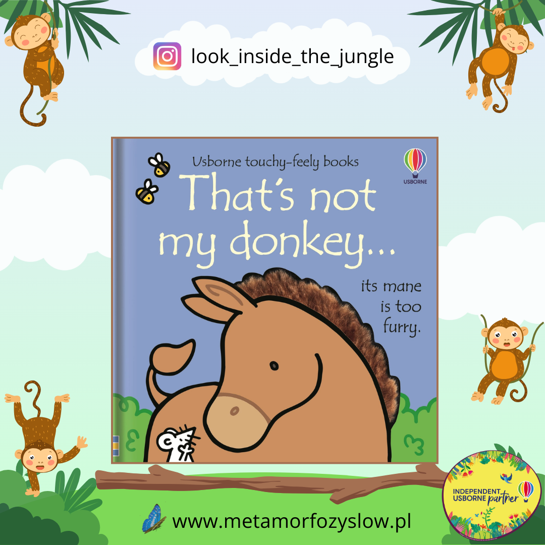 That's not my donkey... – sympatyczny osiołek wprowadza najmłodszych w świat zmysłów i odczuć. Dzięki różnym fakturom wkomponowanym w ilustracje niemowlę odrywa, co to znaczy furry, tufty, soft czy fluffy. Kartonowa książka z pogrubionymi stronami i zaokrąglonymi stronami wesprze maluszka w odkrywaniu nowych wrażeń. Krótkie fragmenty tekstu, oparte na powtarzalnej frazie, w sam raz na początek przygody z językiem angielskim.