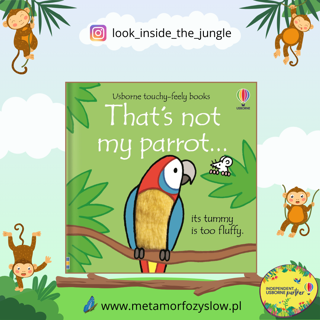 That's not my parrot... – książka dla niemowląt z elementami sensorycznymi. Na każdej stronie dziecko znajdzie inny materiał wkomponowany w wygląd tytułowej papugi. Krótki tekst po angielsku, z którego dziecko pozna pierwsze części ciała ptaków oraz opisujące je przymiotniki.