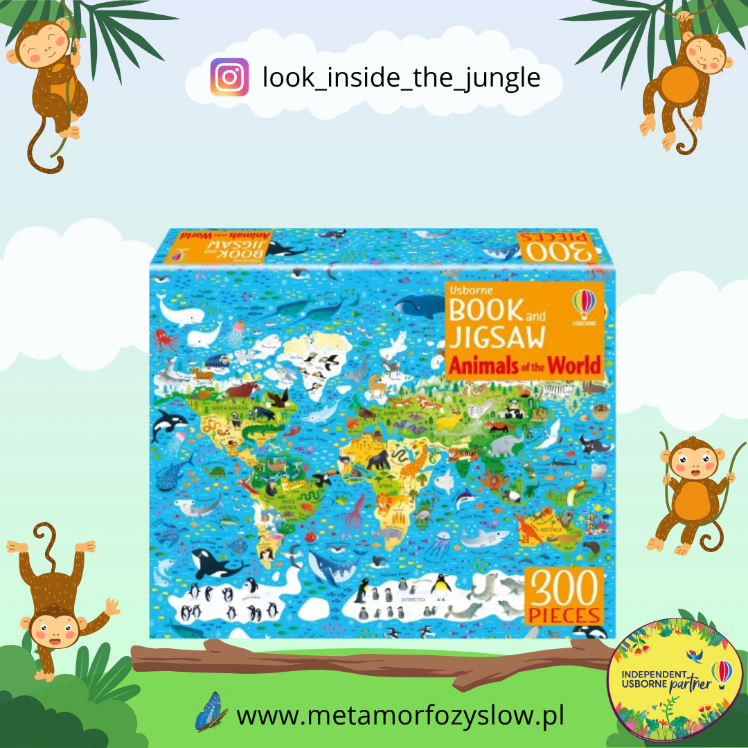 Usborne Book and Jigsaw Animals of the World – zestaw puzzli (300 elementów) z książką. Ilustracja do ułożenia przedstawia zwierzęta świata rozmieszczone na kontynentach, na których żyją. Przy każdym zwierzęciu jest jego nazwa po angielsku, a w dołączonej książce krótki opis.