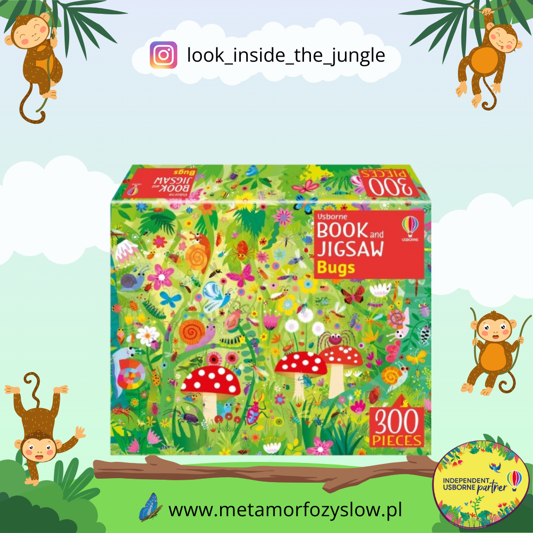 Usborne Book and Jigsaw Bugs – zestaw puzzli (300 elementów) z książką po angielsku (bogato ilustrowana wyszukiwanka). Tematem przewodnim są owady i robaki.