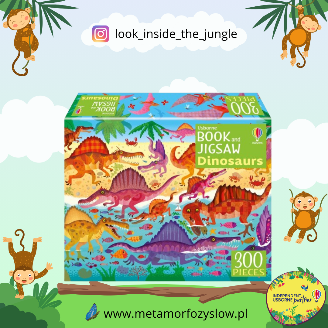 Usborne Book and Jigsaw Dinosaurs – duży zestaw puzzli (300 elementów) z wyszukiwanką obrazkową po angielsku przedstawiający dinozaury.