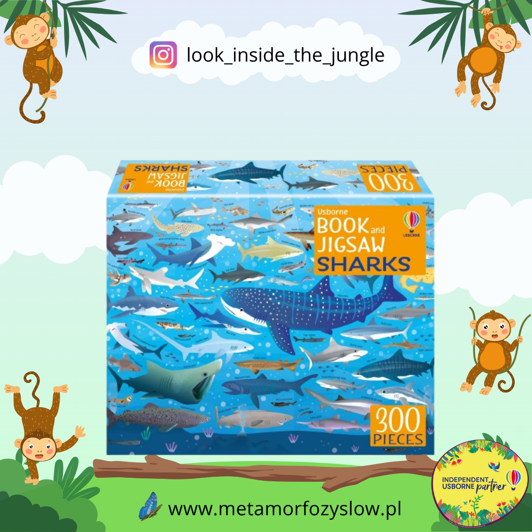 Usborne Book and Jigsaw: Sharks – zestaw puzzli (300 elementów) z książką po angielsku. Tematem przewodnim są rekiny. Przedstawione na obrazku okazy zostały krótko scharakteryzowane w książce. Do zestawu autorzy przygotowali zbiór linków z filmami, quizami i kartami pracy.