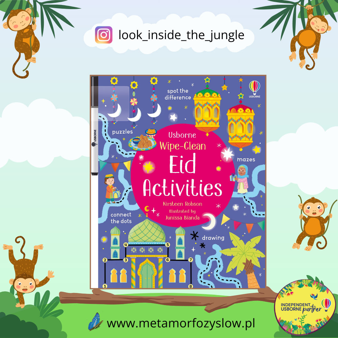 Wipe-Clean Eid Activities – książka z pisakiem wymazywalnym dla przedszkolaków. Dzieci znajdą w niej dużo zadań, dzięki którym będą mogły ćwiczyć sprawność manualną: znajdywanie różnic, łączenie po numerach, labirynty, dorysowywanie brakujących elementów, liczenie. Ich tematyka koncentruje się wokół muzułmańskiego święta Eid al-Fitr.