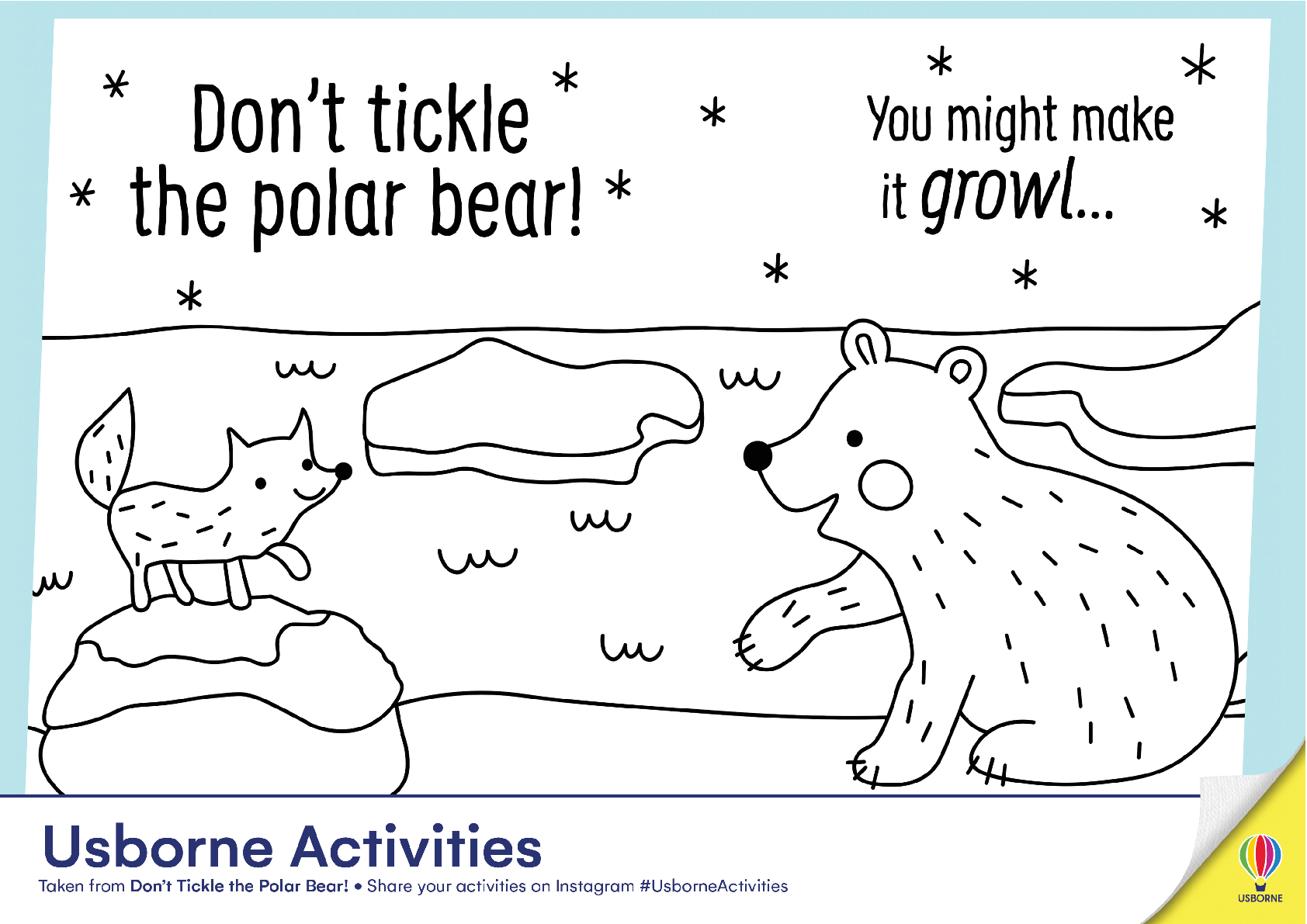 Dwie ostatnie frazy zostały umieszczone także na kolorowance z misiem polarnym do książki Don’t Tickle the Polar Bear. Możesz ją pobrać za darmo i wykorzystać z dziećmi w domu lub przedszkolu.